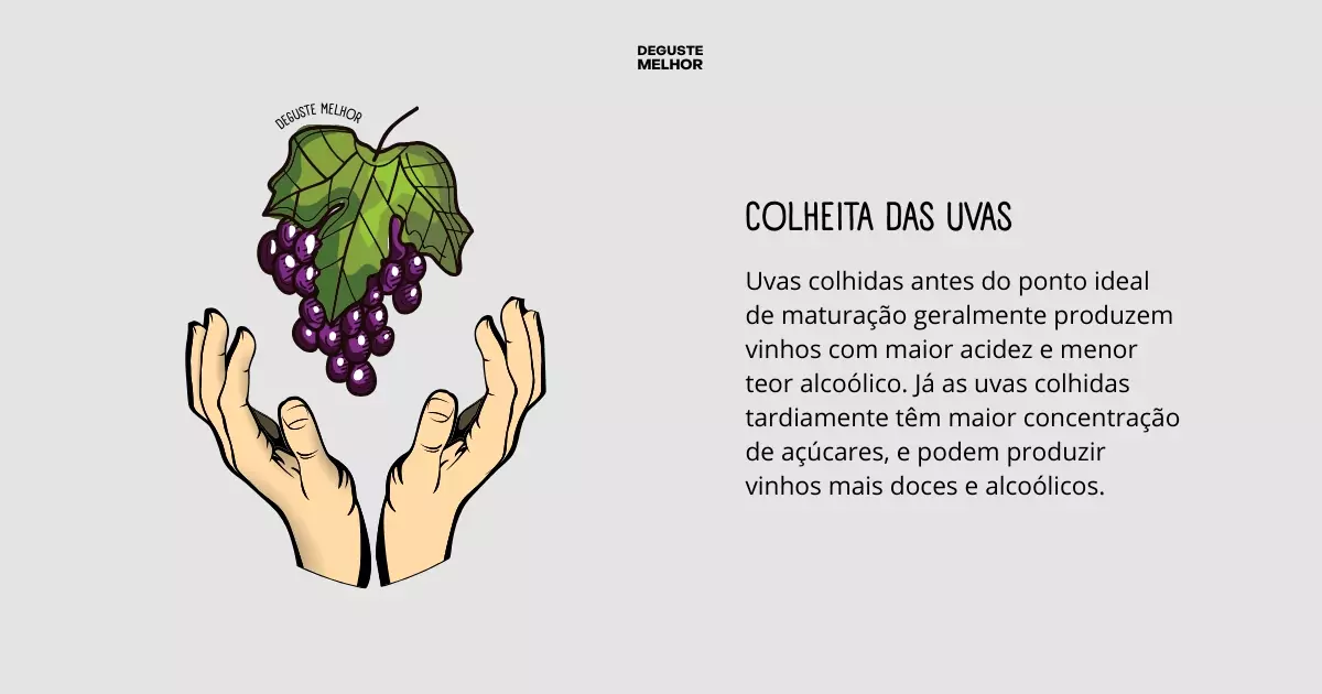 Uvas colhidas antes do ponto ideal de maturação geralmente produzem vinhos com maior acidez e menor teor de álcool. Já as uvas colhidas tardiamente têm maior concentração de açúcares, e podem produzir vinhos mais doces (como os vinhos de sobremesa) e, também, vinhos mais alcoólicos.