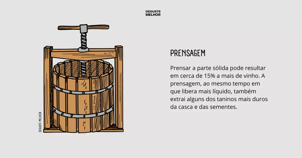 Este processo é realizado com bastante cuidado, já que o ato de pressionar, ao mesmo tempo em que libera mais líquido, também extrai alguns dos taninos mais duros da casca e das sementes.