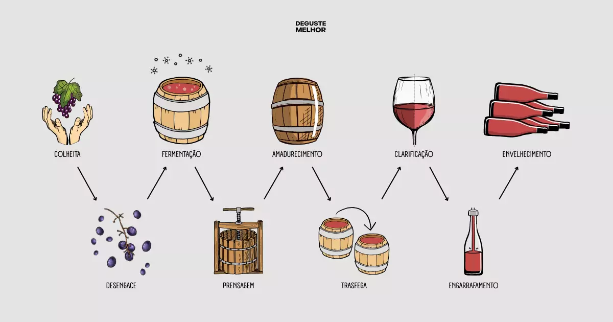 - Para deixar o conteúdo enxuto e não tornar a leitura cansativa, aqui são apresentadas as principais etapas da produção do vinho tinto, e não todas as etapas. Algumas técnicas de elaboração que não estão entre as principais etapas foram mencionadas no final da página.